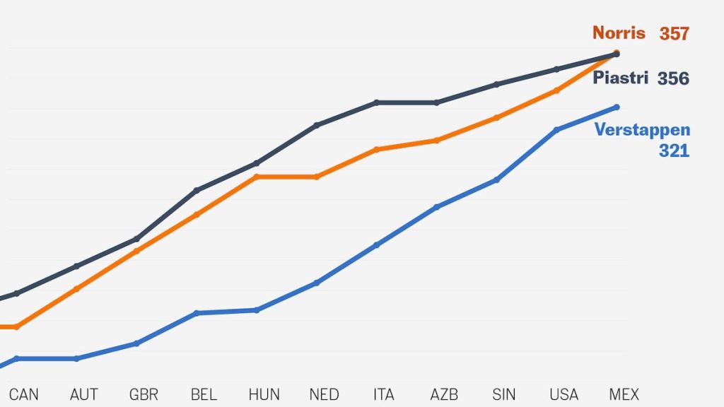 A falta de solo cuatro carreras, el campeonato mundial de Fórmula 1 se ha vuelto completamente impredecible. Tres pilotos están en la lucha: Lando Norris y Oscar Piastri, compañeros en McLaren, llegan separados por un solo punto y con Max Verstappen (Red Bull), el defensor del título, aún al acecho a 36 puntos del líder. Con el sistema en vigor desde 2010, que otorga 25 por victoria, todavía es posible cualquier escenario.Durante gran parte del año la pelea ha sido entre los dos jóvenes de McLaren, que buscan su primer título, pero tras el parón de verano, Verstappen se sumó a la contienda. El ganador de los últimos cuatro mundiales mantiene vivas sus opciones tras una gran remontada.Los mercados de predicción online son buen termómetro de las apuestas de quienes siguen el campeonato. En Polymarket, uno de los más grandes, Norris lidera tras su contundente triunfo en México, donde sus rivales cedieron terreno: Verstappen fue tercero y Piastri, quinto. En las últimas cinco carreras, el británico ha sumado más puntos que su compañero y recuperó el liderazgo del campeonato por primera vez desde la cuarta fecha, disputada en Arabia Saudí.Piastri es el que llega en peor forma. Lleva cuatro carreras sin subir al podio y ha tenido que soportar la presión de ser el piloto a batir durante gran parte de la temporada. Su punto más bajo fue el Gran Premio de Azerbaiyán, donde se estrelló en la primera vuelta y debió abandonar.Quien no tiene nada que perder —y sabe lo que es ser campeón— es Verstappen. De hecho, su primer título, en 2021, se lo arrebató a Lewis Hamilton, que venía de conquistar los cinco mundiales anteriores con Mercedes, en un final de película en el último gran premio de la temporada. De las últimas seis carreras, el neerlandés ganó tres y subió al podio en las restantes.Aún quedan 116 puntos en juego: 25 por cada una de las cuatro carreras, más las dos sprint (en Brasil y Qatar), pruebas más cortas que se celebran los sábados antes de la clasificación y otorgan ocho puntos al vencedor. La primera batalla será este fin de semana en Brasil, donde el año pasado Verstappen logró un épico triunfo bajo la lluvia tras salir desde el puesto 17. En la sprint, en cambio, el ganador fue Norris.El final más ajustado desde 2010Para retener el título, el neerlandés necesita ganar la mayor cantidad de carreras posibles y esperar malos resultados de sus rivales. Si Verstappen vence en todas y Norris es segundo, el británico se proclamará campeón. Tampoco le bastaría al piloto de Red Bull si quien finaliza segundo en cada prueba es Piastri. De conseguirlo, Verstappen firmaría probablemente la mayor remontada en la historia de la Fórmula 1. Desde que en 2010 se instauró el actual sistema de puntuación —25 puntos por victoria—, la más destacada fue la de Sebastian Vettel en 2012. A falta de siete carreras, el alemán estaba 39 puntos por detrás de Fernando Alonso, pero encadenó cuatro triunfos consecutivos y acabó ganando el Mundial por solo tres puntos, en una final inolvidable en Interlagos.Otra remontada célebre fue la de 2007. Kimi Räikkönen (Ferrari) llegó a las dos últimas carreras con 17 puntos menos que Lewis Hamilton, cuando el triunfo otorgaba 10. Dos victorias consecutivas —en China y Brasil— y el desplome de McLaren permitieron al finlandés conquistar el título por un solo punto de ventaja sobre Hamilton y Fernando Alonso.
